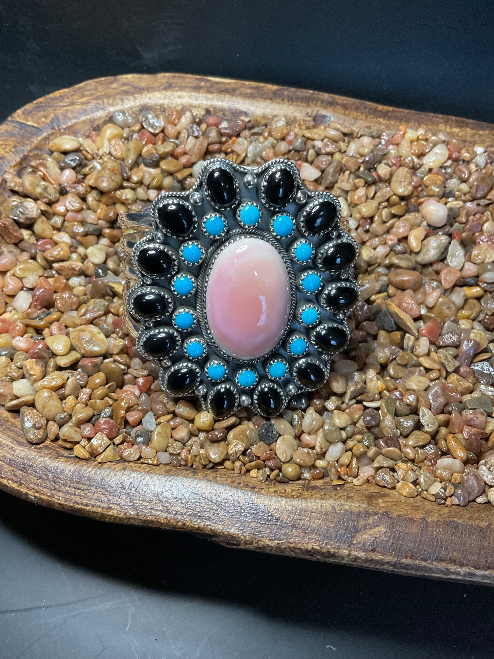 XL Black Onyx, Pink Conch & Sleeping Beauty Cluster Cuff 6.5” inc gap Stamped & Signed