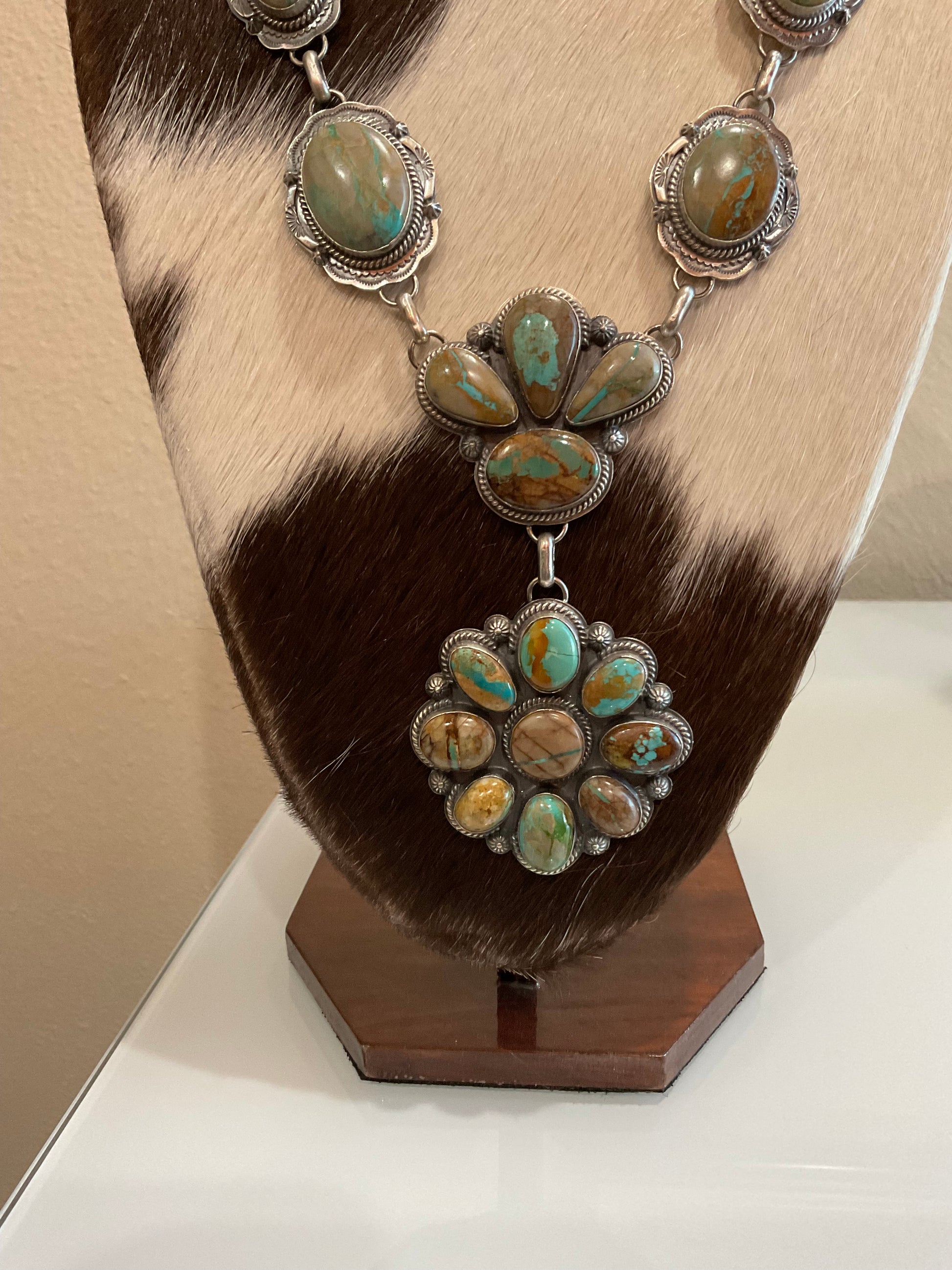 XL Boulder Ribbon Lariat 44” Total, Chain 19”/Drop 13”, Each Stone is 1.5”, Top Cluster 2”, Bottom Cluster 2.5” Artist-GP (Gilbert Platero)
