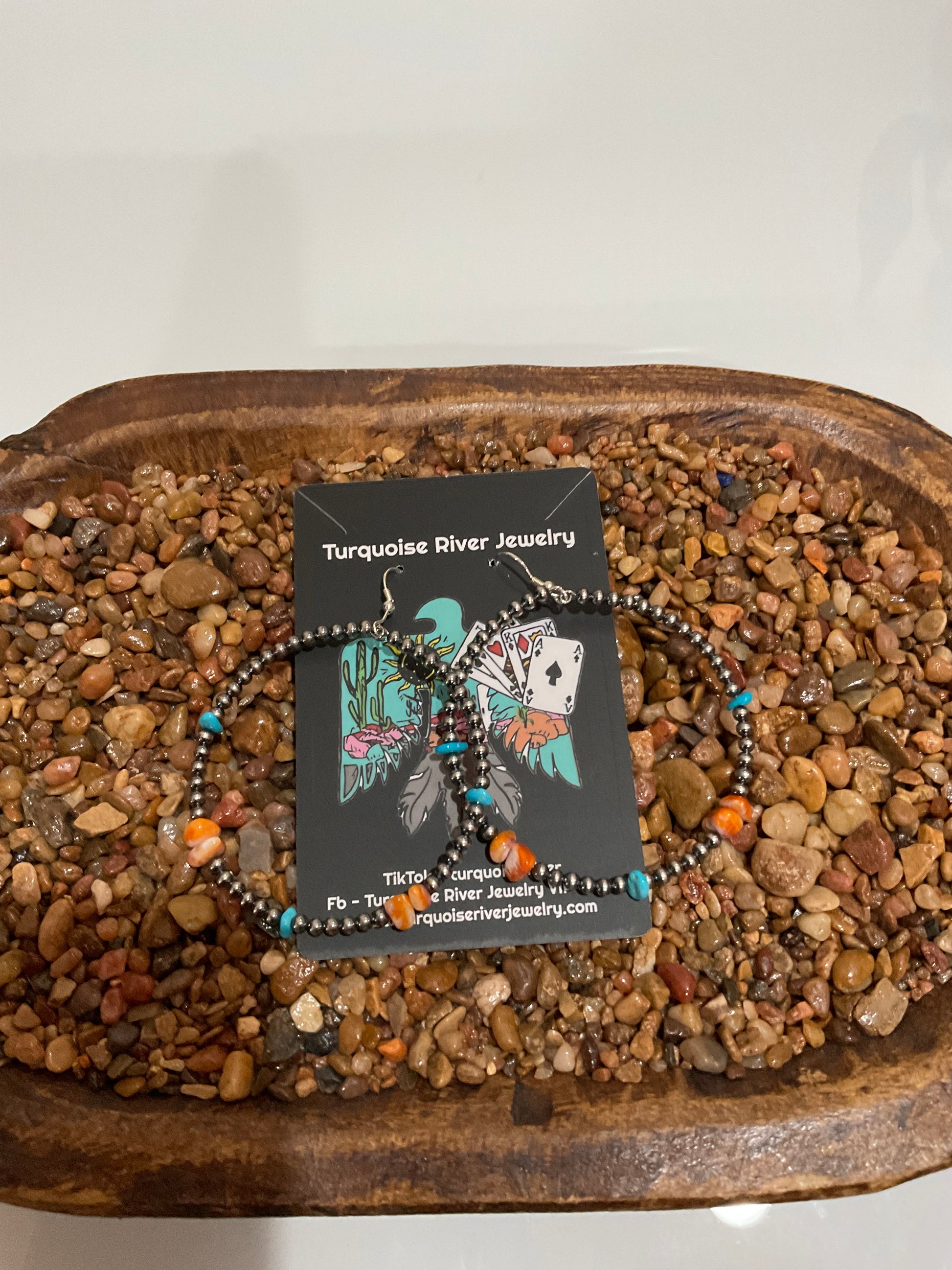 Round Kingman & Orange Spiny w/3mm Sterling Silver Pearls 3”