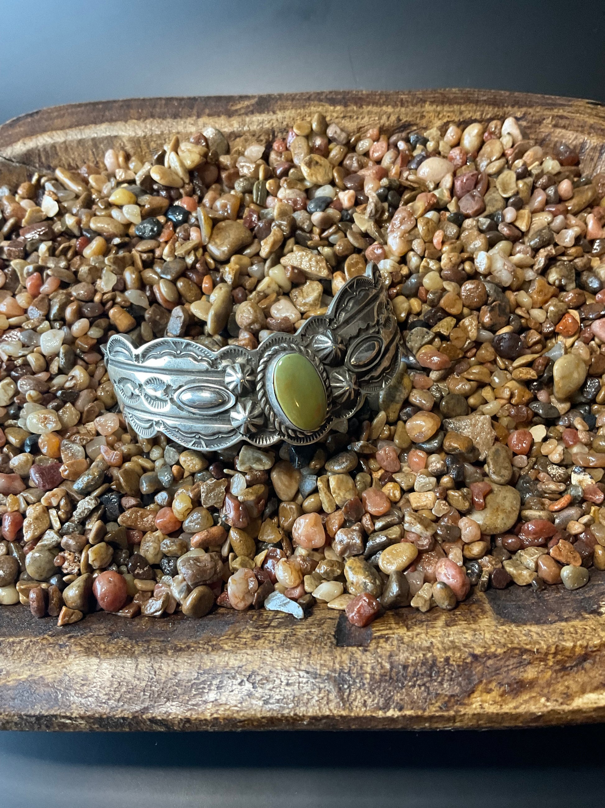 I Stone Oval Green Royston w/detailed band 6.25” inc gap Artist-EMT