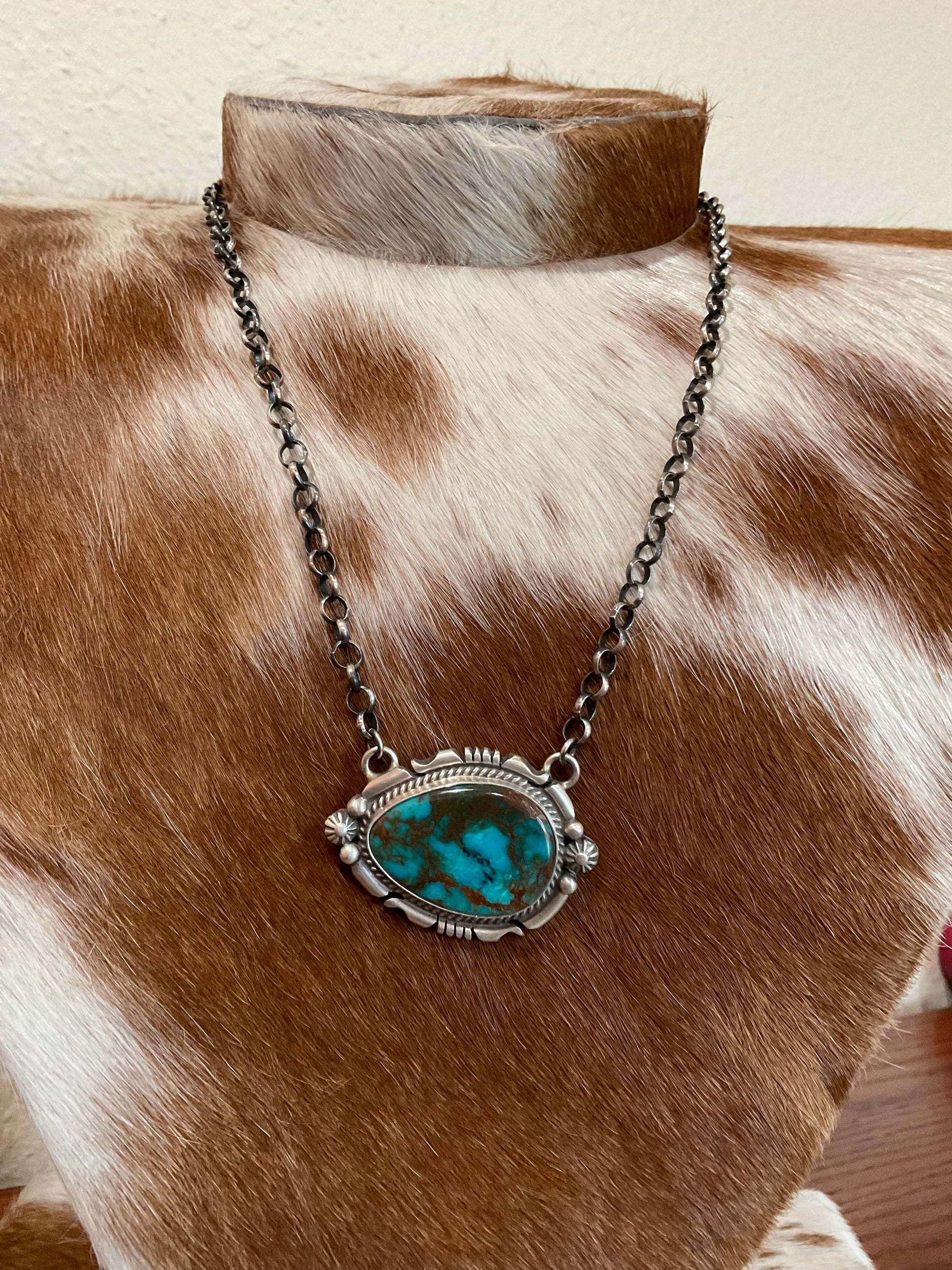 Pilot Mountain Turquoise W/Matrix 20”/Pendant 1.25”X1.75” Artist-Jon McCray
